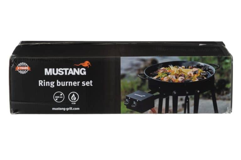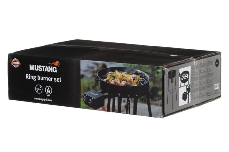 Ring burner with two rings. Diameter 40 cm, wind shield and tripod. Power 9,0 kW. In the wind shield, there is a hole for lighting the burner and hanging hooks for grilling accessories. The set includes an enameled paella pan, diameter 46 cm. Warranty 2 years.