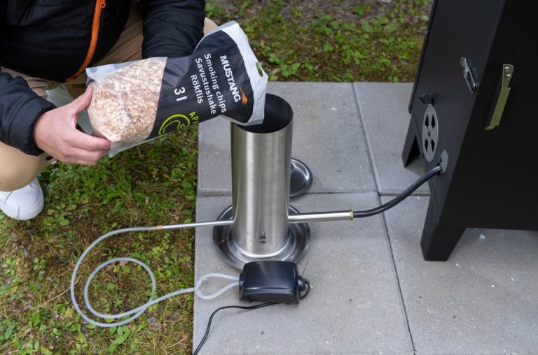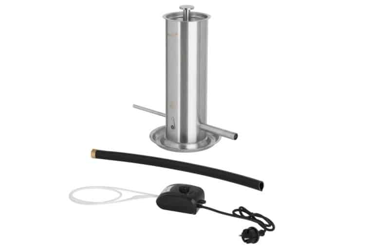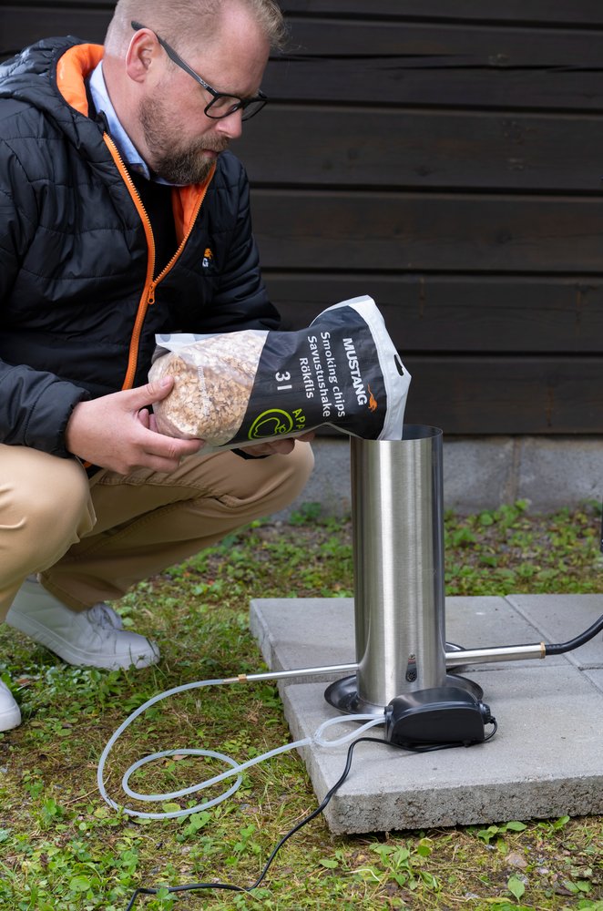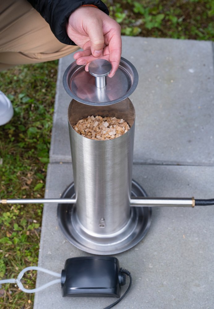 Smoke generator for cold smoking. Stainless steel cylinder with lid on top. Volume of cylinder 3 L. Smoking chips will smolder slowly inside the cylinder, generating perfect smoke for cold smoking. A full pipe produces smoke for about 10-12-15 hours, depending on the air pump settings. The generated smoke is blown to the desired place using an air pump. A 50 cm long silicone tube attached to the end of the smoke pipe makes it easier to direct the smoke into the desired place. The temperature of the smoke is very low, which makes the item perfectly suitable for cold smoking. Smoke is generated using smoking chips suitable for hot smoking. Suitable smoking chips: 229812, 280761, 304833, 637551. The air pump has a protection class of IPx4. The air pump has a one year warranty
