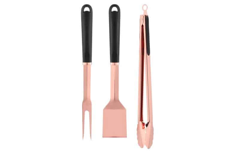 Ruostumattomasta teräksestä valmistetut laadukkaat grillausvälineet. Ruusukulta pinnoite. Sarja sisältää lastan, pihdit ja puhdistusharjan.
